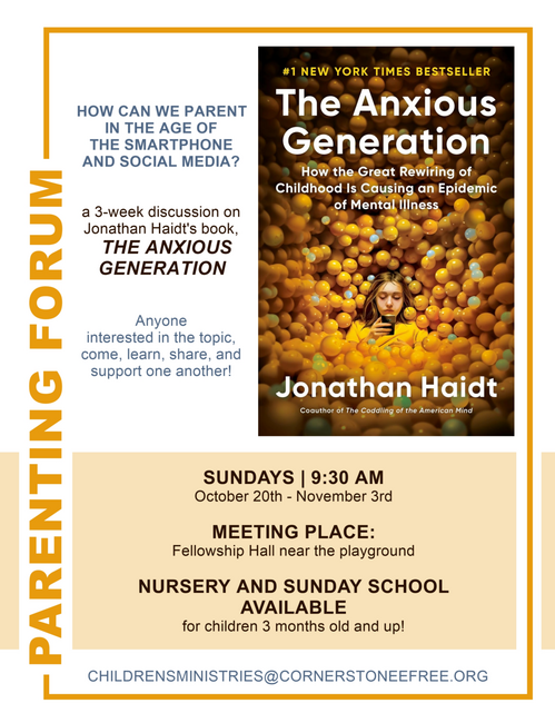 There will be a Big Breakfast in the Parenting Forum from 9:30-10am, followed by our last discussion on Paul David Tripp's book "Parenting". Bring some breakfast food to share and join us!